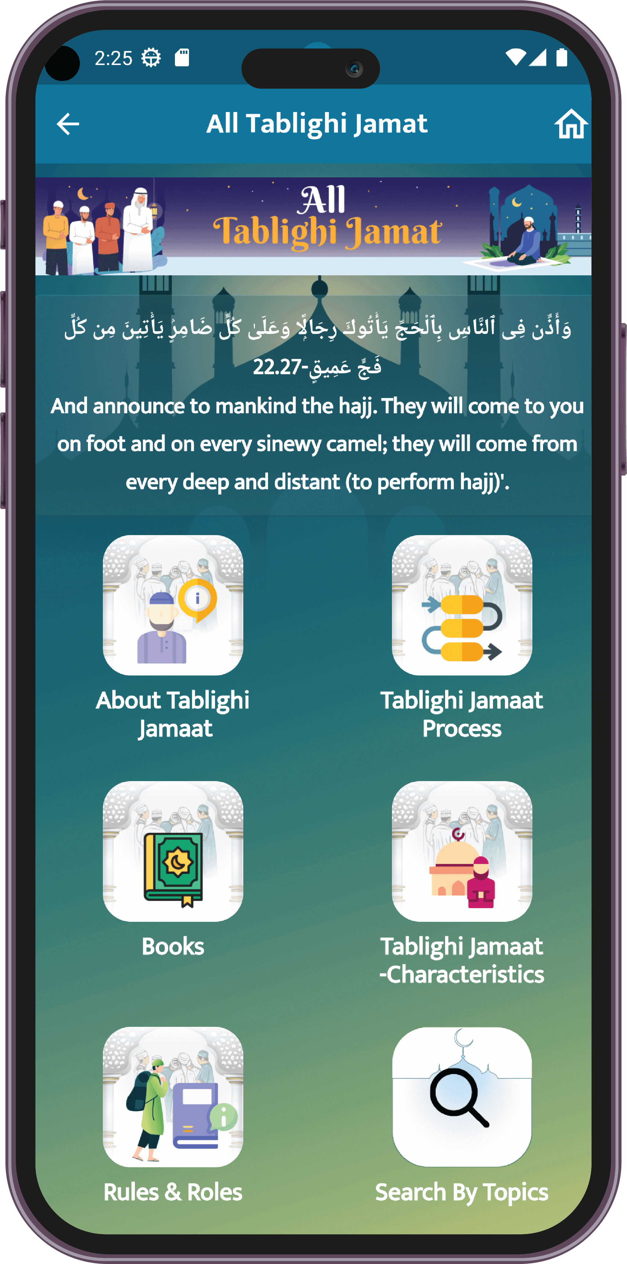 In this App we discover the history of Tablighi Jamaat, Qualification for Tablighi Jamaat, main Purpose/Action of Tablighi Jamaat, Leading Scholars of Tablighi Jamaat and why need Tablighi Jamaa