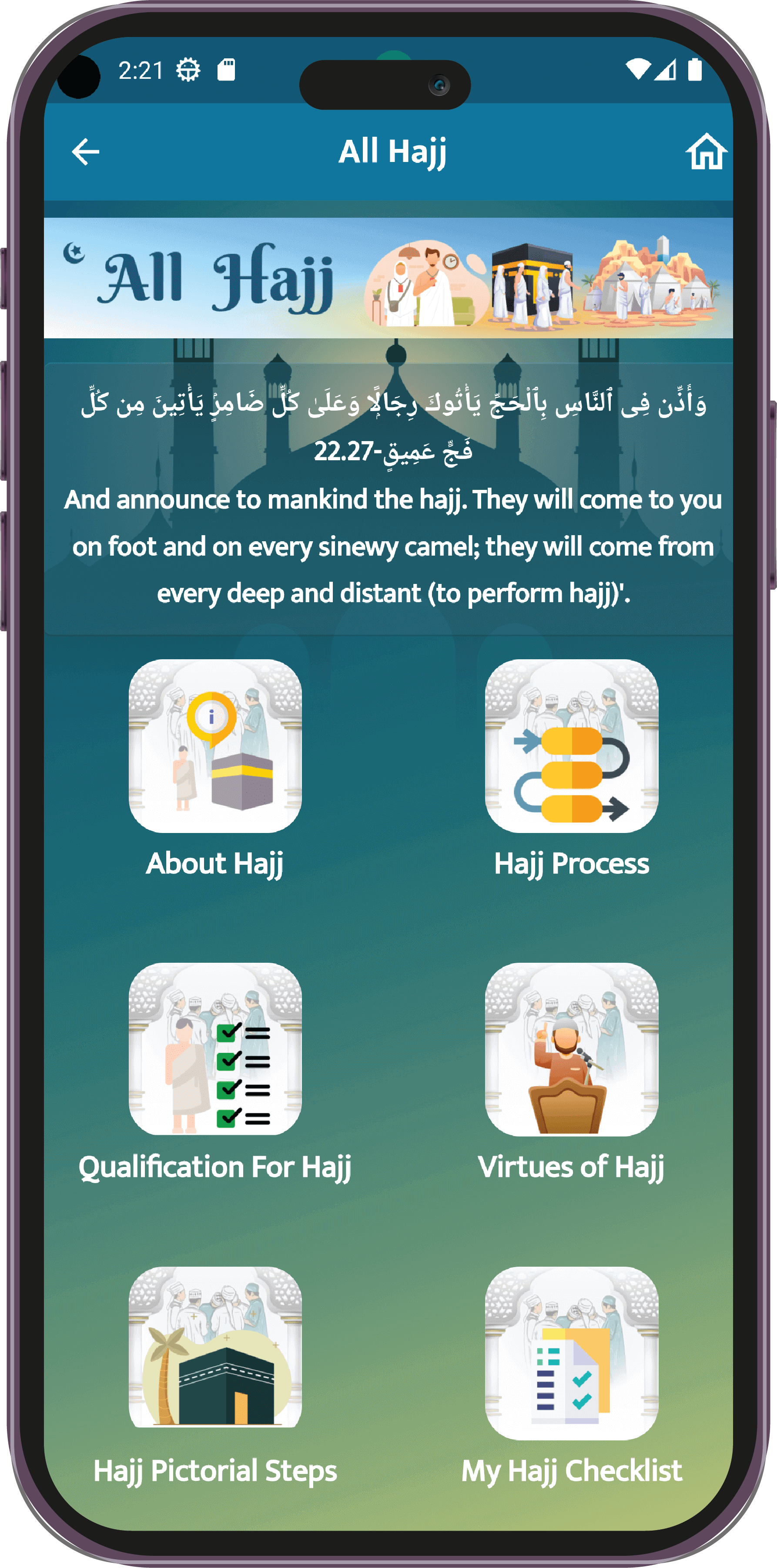 The Hajj feature in our app is an invaluable tool for you plan to perform the pilgrimage to Mecca. This feature can provide you with detailed information on Virtues of Hajj, Step by Step Hajj Process and get access to Hajj Workshop by Ustadh Baajour.